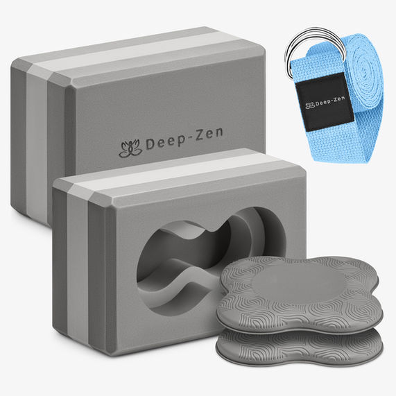 This versatile yoga block 2 pack set includes 2 workout blocks, 2 knee pads for added comfort on hard surfaces, and a yoga strap to deepen your stretches: a unique combo instead of plain stretching blocks you can find elsewhere